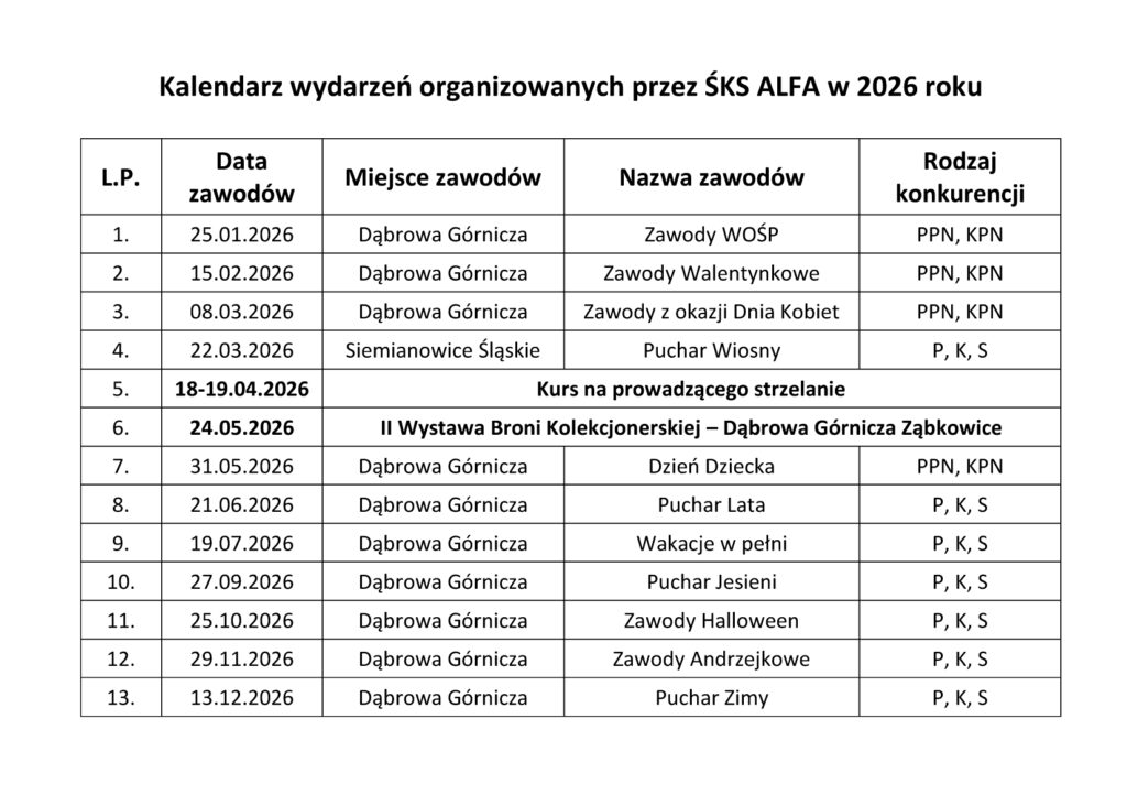 Śląski Klub Strzelecki ALFA, zaprasza na kurs prowadzącego strzelanie, który przeprowadzony zostanie w dniach 18-19 kwietnia 2026 od godz. 9:00 w Dąbrowie Górniczej ul. Dolomitowa 37A